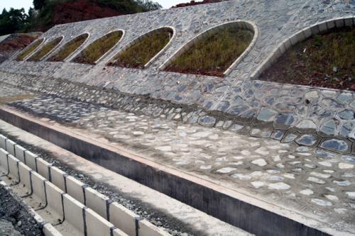 (2)路基填土高度H>3m,時,采用漿砌片石襯砌拱防護,當3&1e;H&1e;4m時,設置單層襯砌拱,當4<H&1e;6m時,設置雙層襯砌拱,拱內鋪設草坪網布被為保證路面水或坡面水不沖刷護坡道,相應于襯砌拱拱柱部分的護坡道也做鋪砌,并設置20號混凝土預制塊至邊溝內側。20號混凝土預制塊的規格分為兩種,拱柱及護腳采用5cm×30cm×50cm的長方體預制塊,拱圈部分采用5cm×30cm×65cm的弧形預制塊(圓心角30度,內徑125cm,外徑130cm),預制塊間用7.5號砌漿灌注。