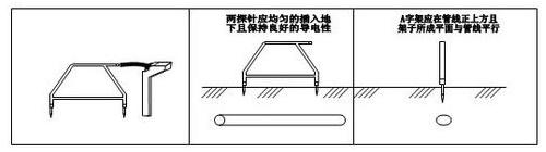 5、管線的對地泄漏電流可由“A”字架兩腳分別接收,而接收機顯示的信號大小則是兩針接收信號的差值,當兩針接收的差值為零時,則說明“A”字架在故障點的正上方