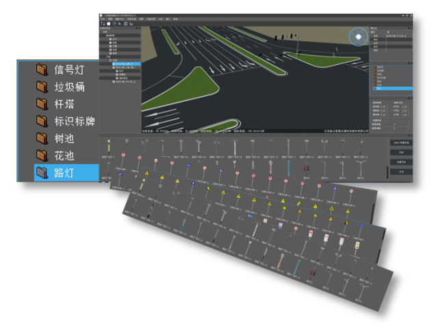 然后,通過3DRoad自動生成三維道路,批量加載道路附屬設施,自動拉伸三維建筑或者加載三維建筑的BIM、3dmax等模型,集成三維場景;
