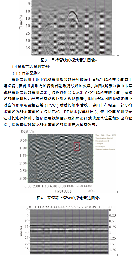電磁法探測管線需要在目標管線上加載和傳遞電流,因此要求目標管線需是金屬等導電材質,而對于非金屬管線來說,它不具備導電的性質,使用電磁法探測就失去了效果。隨著城市非金屬材質地下管線的鋪設越來越常見,傳統的金屬管線探測儀已不能滿足地下管線探測的要求,而探地雷達技術作為新的探測手段,能夠完成非金屬管線的探測工作,彌補了金屬探測儀的不足。