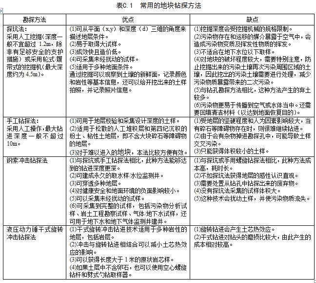 用于地塊環(huán)境評價的鉆探技術需結合地塊所在地區(qū)的地層條件、地塊鉆探的作業(yè)條件和地塊勘察的方案要求來選擇經濟有效的鉆探方法。表C.1列出北京市地塊環(huán)境評價中的常用的鉆探方法及其優(yōu)缺點。