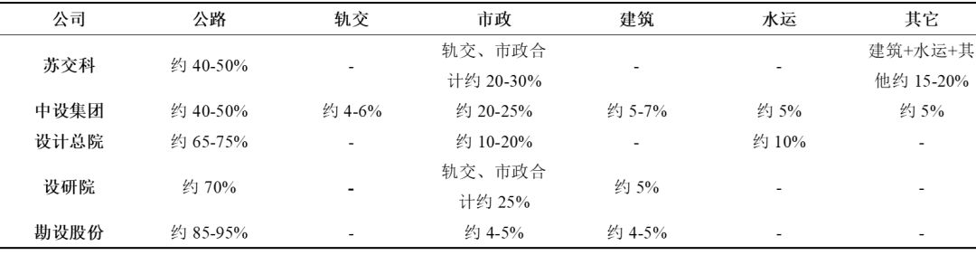 主要基建設計公司目前基建細分設計業務占比對比:公路設計較高