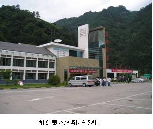 受占地空間的限制,服務(wù)區(qū)內(nèi)會最大程度地增加建筑面積和停車場面積,如服務(wù)區(qū)規(guī)劃設(shè)計(jì)充分利用原地貌、地物資源,結(jié)合周邊地理環(huán)境進(jìn)行設(shè)計(jì),這實(shí)際上將是對自然環(huán)境的開發(fā)和保護(hù),如圖6所示西漢高速公路的秦嶺服務(wù)區(qū)即為一例。