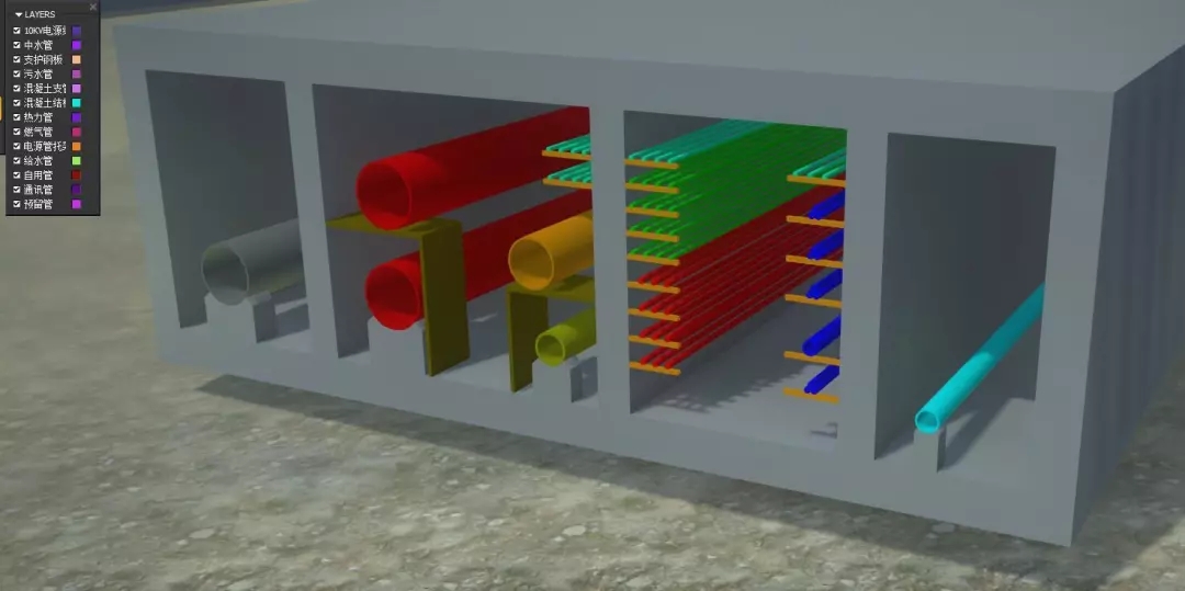 重建管網現狀模型。項目區域地下管網錯綜復雜,為探明復雜的管網現狀,避免設計延誤。項目組研發管網建模工具,重構了完整的地下管網BIM模型,準確定位,便于管廊設計與遷移。