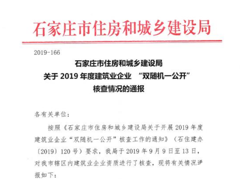 月26日石家莊住房和城鄉建設局發布《關于2019年度建筑業企業 “雙隨機一公開” 核查情況的通報》,2019年9月9日至13日石家莊住房和城鄉建設局對轄區內建筑業企業資質進行了核查,本次共核查238家建筑業企業,其中僅41家達到資質標準要求,共有135家企業不合格。
