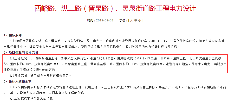 工程概況:西峪路道路工程:西中環至大井峪街,道路長約1.2公里,規劃紅線寬40米;縱二路(晉泉路)道路工程:北山防火通道街至靈泉街,道路長約900米,規劃紅線寬20米;靈泉街道路工程:晉泉路至縱一路,道路長約500米,規劃紅線寬24米。建設內容:道路、雨污水、電力、照明及交通設施等。工程總投資額約9500萬元。