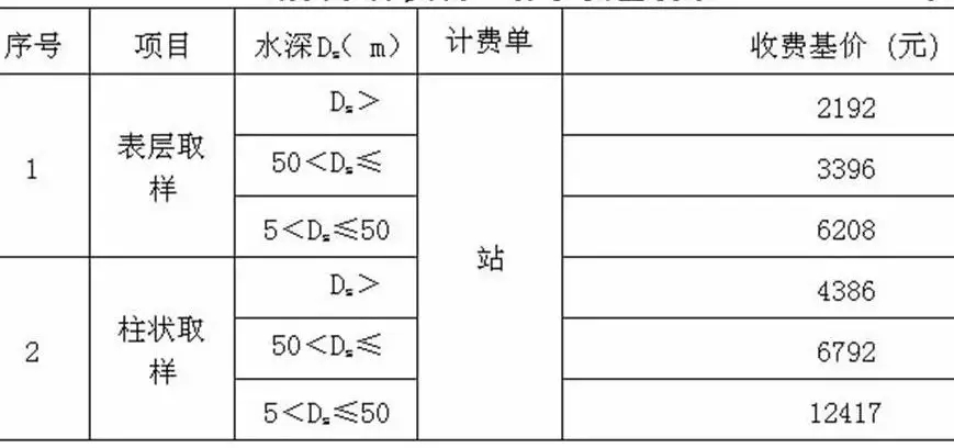 在《工程勘察收費標準》里,除了看2.3節(jié)里的“水域測量”部分外,還需要關(guān)注第16部分的“海洋工程勘察”部分,該部分對多波束海底地形測量,海底面狀況掃側(cè),底質(zhì)取樣,氣象、潮位、波浪觀測,海流、鹽度、泥沙觀測,海洋工程地質(zhì)鉆探,海底地層測量,及其他海洋工程勘察項目,等等都作出了勘察收費依據(jù)。這里,海底面狀況掃側(cè)是指掃海測量,海底地層測量可以對應(yīng)淺地層剖面測量。而海底地層測量又細分聲學(xué)地層探測、單道地震探測及多道地質(zhì)探測三類。在其他海洋工程勘察項目部分中,地磁觀測可以與海洋磁力測量對應(yīng),另外還包括沉積物化學(xué)、污損生物、水化學(xué)等內(nèi)容。