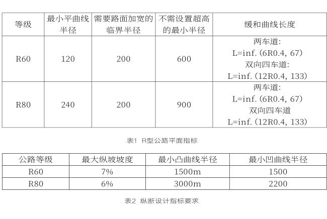 R型公路主要分為R60和R80兩個(gè)等級(jí),其主要平面指標(biāo)見表1。
