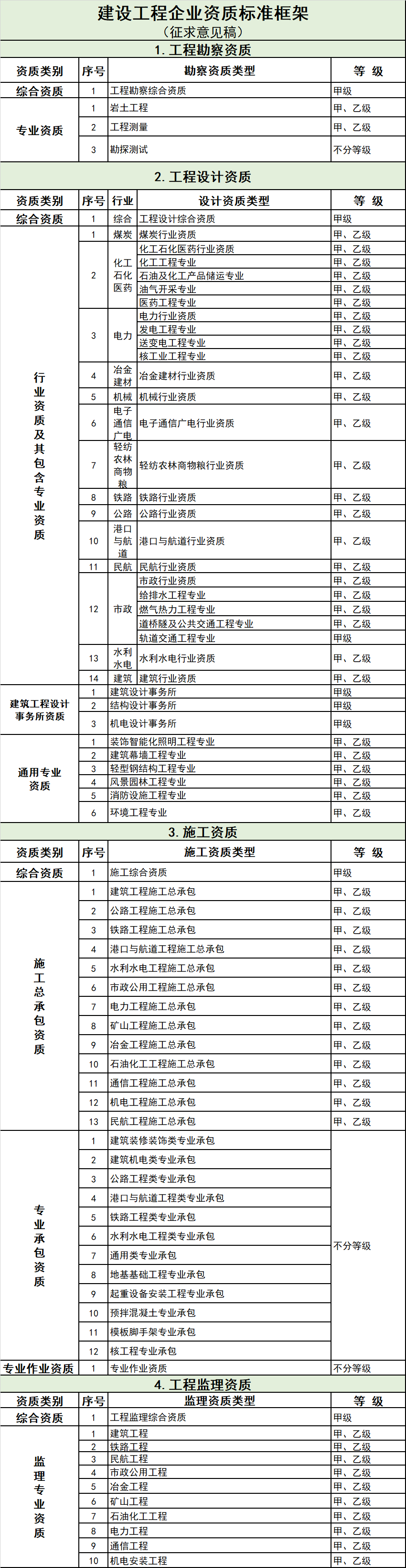 其中 施工總承包特級資質調整為施工綜合資質,施工總承包一、二、三級資質等級壓減為甲、乙兩級,甲級資質在 本類別內承攬業務規模不受限制,原一級資質調整為甲級資質,其他等級資質合并為乙級資質。