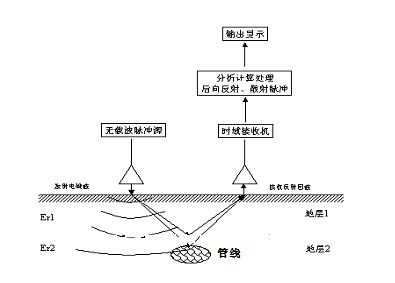 地質雷達探測地下空洞是利用空洞與土層的電性差異來實現的。由于路面、土層、空洞、管線是不同的材料構成,不同材質間的接觸面及同一種材質內部不連續面都是良好的雷達波反射界面(即管線、空洞與土層接觸面、路面與土層的分界面等)。當雷達波向下傳播經過這些界面時,都會發生不同程度的反射、折射和散射,產生不同程度的波能吸收和衰減,集中反映在波形和波阻特征變化上。分析研究接收回波的特征差異,就可以揭示路面地下管線特征。
