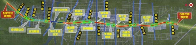 復興大街市政化改造工程,本次改造按照設計速度100公里/小時、雙向8車道城市快速路標準進行設計建設,標準路基寬度34.5米。全線新建大橋13座,總長4436米,其中滹沱河景觀特大橋2300米,泊水公園景觀大橋605米;新建地下隧道3座,總長5.02公里,其中正定古城段隧道2.51公里,白佛隧道1.23公里,學苑路隧道1.28公里;全線共設置互通立交11座(改造現有互通立交3座、新建互通立交4座、預留互通立交4座),增設出入口匝道16對(預留1對)。同時,結合區域交通需求,在滹沱河北大堤至月牙路段與和平路至南二環段局部增設輔路系統,輔路總長約5.3公里,按照設計速度50公里/小時、雙向四車道的城市主干路標準建設,兩側設置人非慢行系統。