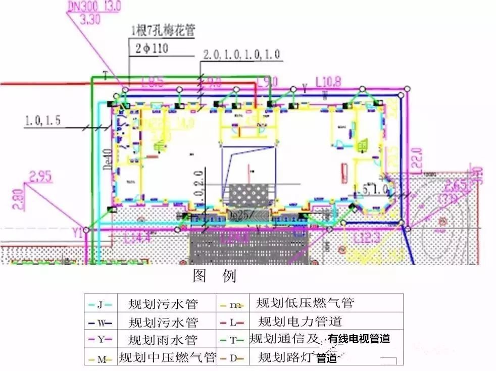 首先應(yīng)考慮室外正負零標(biāo)高為黃海高層的高度,考慮項目場地回土覆土高度,項目周邊路面標(biāo)高,項目建成后邊界外的小區(qū)環(huán)路標(biāo)高,查看這3個標(biāo)高之間的關(guān)系,搞清楚周邊市政管網(wǎng)的布置及標(biāo)高,根據(jù)施工現(xiàn)場實際情況進行室外管網(wǎng)的綜合布置。