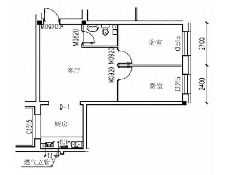在室內(nèi)鋪設燃氣管線時,必須注意:①不能鋪設在潮濕或含有腐蝕性介質(zhì)的房間,也不能將其引入臥室,特別是在臥室、浴室或衛(wèi)生間里;②嚴禁通過易燃、爆炸物品、配電間、變電所、煙、風道等場所;③橫穿臥房、衛(wèi)生間或地下室的管道,應在套管內(nèi)安裝焊接;④如需放置于潮濕或有腐蝕性介質(zhì)的室內(nèi),則應采用防腐蝕措施;⑤管道穿越樓板、樓梯平臺、墻壁、隔墻時,應將管線置于套管內(nèi)。⑥安裝燃氣灶的房間凈高不宜低于2.2米,安裝熱水器的房間應該宜大于2.4米。如圖3所示,室內(nèi)廚房豎管的設計。