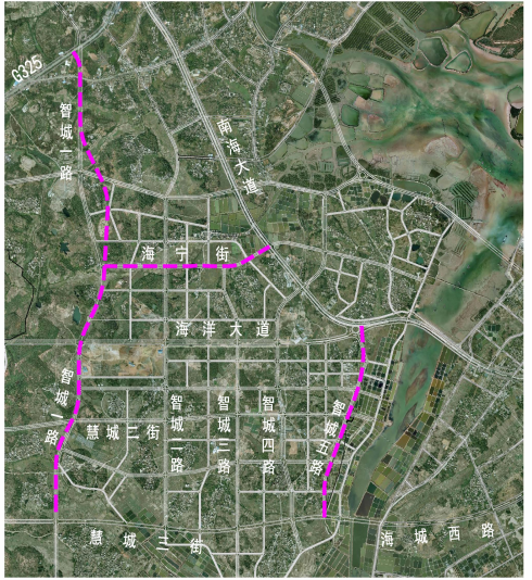 本次設(shè)計包括智城一路、智城五路、海寧街三條市政道路。智城一路為高地智慧城內(nèi)南北走向的城市主干路,南起慧城三街,北至325國道,路線全長5198.815m,紅線寬度40m,設(shè)計速度60km/h。智城五路為高地智慧城內(nèi)南北走向的城市次干路,南起慧城三街,北至南海大道,路線全長2158.647m,紅線寬度36m,設(shè)計速度50km/h。海寧街為高地智慧城內(nèi)東西走向的城市次干路,西起智城一路,東至南海大道,路線全長1862.438m,紅線寬度36m,設(shè)計速度40km/h。道路沿線主要為村莊及待開發(fā)用地,道路用地主要包括農(nóng)民的居住用地、耕地、菜地、苗圃、山丘、林地和魚蝦塘等等,局部地段有嶺地、河流、石化管線及高壓線穿過,既有建筑物較多,類型包括民宅、祠堂、學(xué)校等,且與G325、S280、海洋大道及多條村道等既有道路存在多次交叉。